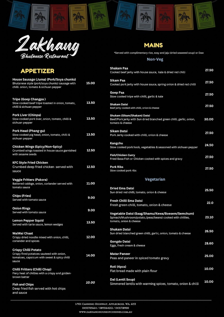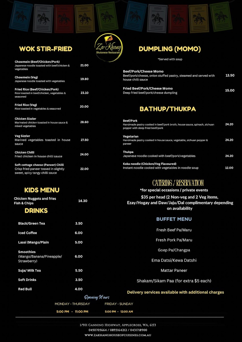 Welcome to Zakhang House Of Cuisines, located at 1/901 Canning Hwy, Applecross WA 6153, Australia. Our menu is a delightful journey through the intricate flavors and traditional recipes from various culinary traditions. At the heart of our offerings, you'll find specialties that are sure to tantalize your taste buds. Start with our succulent Beef Dumplings, perfectly seasoned and steamed to perfection. For an authentic twist, try the Goep Paa, a dish that showcases our dedication to bold and hearty flavors. Our Pakoras are a crisp delight, seasoned with just the right amount of spice, making them a perfect appetizer or snack. Don't miss out on our Veg Fried Rice, a staple that's both comforting and delicious, packed with fresh vegetables and aromatic spices. We invite you to indulge in these highlights and discover many more delightful surprises on our carefully crafted menu. Come taste the adventure at Zakhang House Of Cuisines!